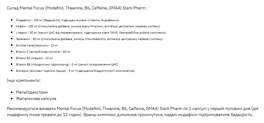 Склад Mental Focus (Modafinil, Theanine, B6, Caffeine, DMAA) Stark Pharm: