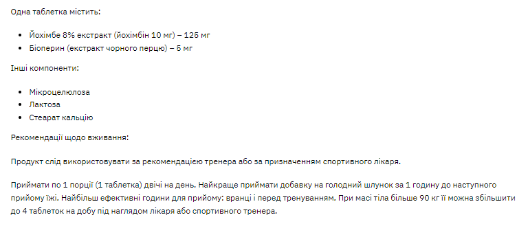 Йохімбе 8% екстракт (йохімбін 10 мг) – 125 мг
