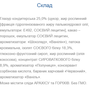 Найбільший та найкращий батончик в Україні. Цілих 28 грам високоякісного білка на 80 грам батончика. Як джерело білка використовується концентрат сироваткового білка, ізолят сироваткового білка та казеїн. Усього 21 грам вуглеводів. У складі ви не знайдете згущеного молока, мальтодекстрину та інших “не дієтичних” інгредієнтів, які так люблять використовувати багато виробників. Протеїнові батончики Monsters: зручний, швидкий та смачний спосіб отримати необхідну порцію справжнього білка та перекусити протягом дня. Поживна цінність 1 батончика (80 грам): Енергетична цінність: 274 кка Білки 28,6 г; жири 6,4 г; Вуглеводи 21 г. Склад: патока, концентрат сироваткового білка 22,63%, ізолят сироваткового білка 13,48%, фруктоза, казеїнат натрію, абрикос сушений (курага), глазур кондитерська (цукор білий кристалічний, жир рослинний, соєвий лецитин, ароматизатор “Какао”, сіль кухонна)