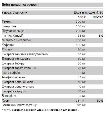 Інгредієнти: L-таурин, харчовий желатин, L-тирозин, піруват кальцію, N-ацетил-L-карнітин, Caffeine® (натуральний кофеїн із кавових зерен), хітозан ( ракоподібні ), гарцинія камбоджійська (шкірка фруктів) 5-6:1 екстракт, Panax ginseng (корінь) 4:1 екстракт, Zingiber officinale (корінь) 20:1 екстракт, Cola acuminata (насіння) 5:1 екстракт, альфа-ліпоєва кислота, Slenderbean® Coffea Robusta (насіння) 12:1 екстракт [Caffeine® і Slenderbean A ® зареєстрована торгова марка Cambridge Commodities Ltd], екстракт Camelia sinensis (листя) 3-4:1 екстракт, Curcuma longa (корінь) 45:1 екстракт, Bioperine® Piper Nigrum (плід) 120:1 екстракт [Bioperine® є Зареєстрована торгова марка Sabinsa Europe GmbH.], Колір (оксид заліза), піколінат хрому.