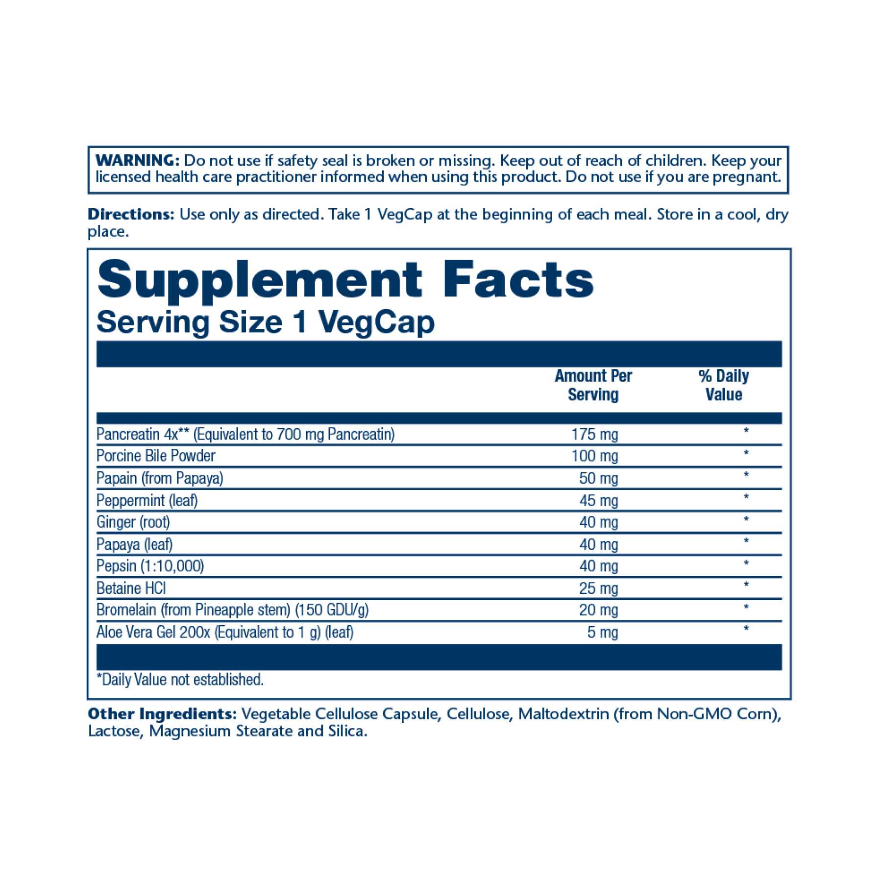 Забезпечує потужну дозу панкреатину 4X (17 500 одиниць протеази та амілази кожна + 1400 одиниць активності ліпази) плюс пепсин і папаїн