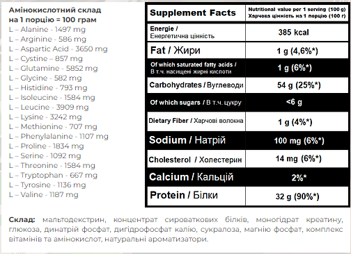 Гейнер містить 80% концентрат сироваткового білка з підвищеним ступенем очистки – більш відомий як WPC INSTANT з додатково підсиленим багатим амінокислотним профілем. Для підвищення ефективності гейнера, в нього додана цінна амінокислота – L-глютамін, яка допомагає швидко відновлювати організм після тренувань. Ще одна цікава особливість
