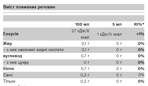 Склад: вода, загусники: ксантанова камедь, целюлоза, ароматизатор, барвник. аміачна карамель, регулятор кислотності: лимонна кислота, консерванти: сорбат калію, натрію, бензоат, підсолоджувач: сукралоза.
