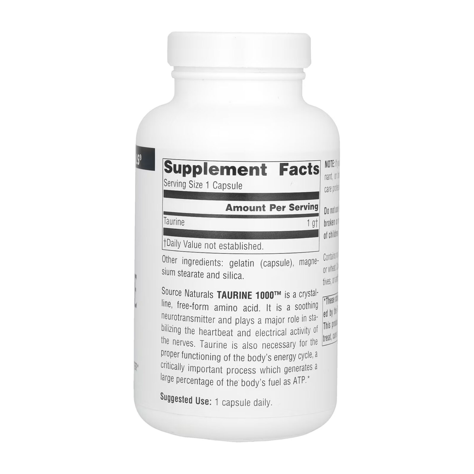 TAURINE 1000™ від Source Naturals — це кристалічна амінокислота у вільній формі. Цей заспокійливий нейромедіатор відіграє важливу роль у стабілізації серцебиття та електричної активності нервів. Таурин також необхідний для нормальної роботи енергетичного циклу в організмі, що є критично важливим процесом, в якому утворюється значна частка енергії організму у вигляді аденозинтрифосфату (АТФ).