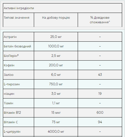 Створений з використанням вибухової суміші кофеїну та креатину, THE Pre-Workout™ забезпечує імпульс, необхідний для максимальної продуктивності та досягнення кращих результатів, ніж будь-коли раніше. Він спеціально розроблений, щоб допомогти вам подолати бар'єри – повторення за повторенням, підхід за підходом. Незалежно від того, чи виконуєте ви кругове тренування з власною вагою або збираєтеся працювати з навантаженнями, THE Pre-Workout™ допоможе вам працювати на повну котушку. Він містить ультрапотужну суміш кофеїну, теакрину та екстракту гуарани, що забезпечує 175 мг кофеїну, який підживлює ваше тренування та допомагає вам тренуватися довше. Крім того, він містить такі вітаміни, як B6, які допомагають вам залишатися на вершині своєї ігрової сесії за сесією, допомагаючи вам досягати своїх цілей ще швидше. Доступний у чотирьох фруктових смаках, включаючи блакитну малину та фруктовий пунш, це чудовий освіжаючий ефект. THE Pre-Workout™: Склад: Кофеїн: потужна суміш містить 175 мг кофеїну, що забезпечує максимальну продуктивність. Креатин: Науково доведено, що допомагає підвищувати ефективність повторення за повторенням, сет за сетом. L-глютамін: амінокислота, що природно присутня в білках, яка допомагає відновлювати нові м'язи. AstraGin®: 100% натуральний продукт рослинного походження, AstraGin® є найпопулярнішим інгредієнтом для тренувань. BioPerine®: отриманий із плодів рослини чорного перцю, додає жару до вашого тренування. Capsimax®: отриманий з перцю кайенского, він розпалює ваше тіло і допомагає спалювати зайвий жир. TeaCrine®: отриманий з теакрину, що схожий на кофеїн, дає вам заряд бадьорості. Для досягнення найкращих результатів приймайте за 30 хвилин до тренування – змішайте 1 мірну ложку з 300-400 мл води. Увага: високий вміст кофеїну. Не рекомендується дітям, вагітним і жінкам, що годують (175 мг кофеїну на 14 г порції). Не перевищуйте вказану добову дозу, що рекомендується. Цей продукт не слід використовувати як заміну різноманітного та збалансованого харчування. Зберігати у прохолодному, сухому місці далеко від прямих сонячних променів. Зберігати у недоступному для дітей місці. Інгредієнти: Блакитна малина: L-цитрулін DL-малат 2:1, моногідрат креатину, бета-аланін, ароматизатор (натуральний ароматизатор, штучний ароматизатор, підсолоджувачі (сукралоза, ацесульфам калію), лимонна кислота,