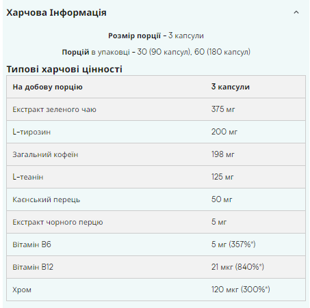 Щоб отримати максимальну користь від Thermopure, рекомендуємо вживати 1 порцію (3 капсули) за 45-60 хвилин перед ранковим тренуванням зі склянкою води або соку. Як варіант, вживайте продукт у час дня. Ключові переваги Підтримує метаболізм макронутрієнтів Містить 150 мг кофеїну для уваги та концентрації Містить вітаміни B6 та B12 Вживати 3 капсули на день. Найкраще вживати на порожній шлунок перед тренуванням. У дні відпочинку пити 1 капсулу вранці, вдень і ввечері. Екстракт зеленого чаю (95% поліфенолів), капсула (желатин), L-тирозин, целюлоза (наповнювач), кофеїн, L-теанін (98%), кетони малини, екстракт кайєнського перцю (30,000-50,000 SHU), магнію стеарат (раз ), діоксид кремнію, вітамін B6 (у вигляді гідрохлориду піродоксину), біоперин, хром (у вигляді піколінату хрому), вітамін B12. Не містить барвників та консервантів, дріжджів, глютена, крохмалю та лактохи. Не містить додавання солі або цукру. Жодних ГМО. Складові на 3 капсули: Поліфеноли (з екстратка зеленого чаю [стандартовані під 98% поліфенолів по УФ, 50% EGCG по ВЕРХ]): 356.25мг Термогенна суміш (кофеїн, кетони малини, порошок кайенського перцю -тирозин: 200мг L-тіанін: 125мг Вітамін B6 (у вигляді гідрохлориду піродоксину): 5мг Біоперин: 5мг Хром (у вигляді піколінату хрому): 120мкг Вітамін B12: 21мкг
