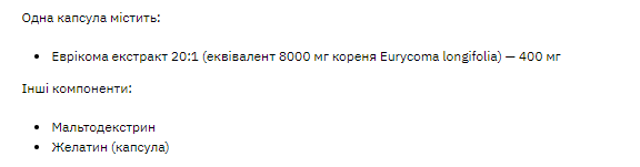 Еврікома екстракт 20:1 (еквівалент 8000 мг кореня Eurycoma longifolia) — 400 мг