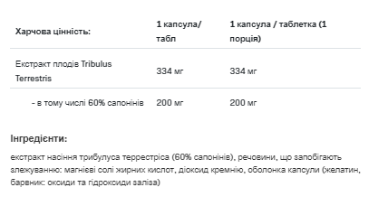 Склад: 100% екстракт Tribulus Terrestris (60% сапонінів), антислежувач: магнієві солі жирних кислот, діоксид кремнію; капсула (вода, яловичий желатин, барвник: діоксид титану).