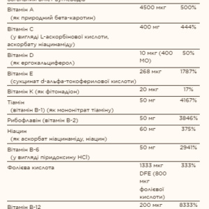 Не містить глютену, пшениці, молочних продуктів, сої, дріжджів, цукру, штучних ароматизаторів, підсолоджувачів, консервантів і барвників.