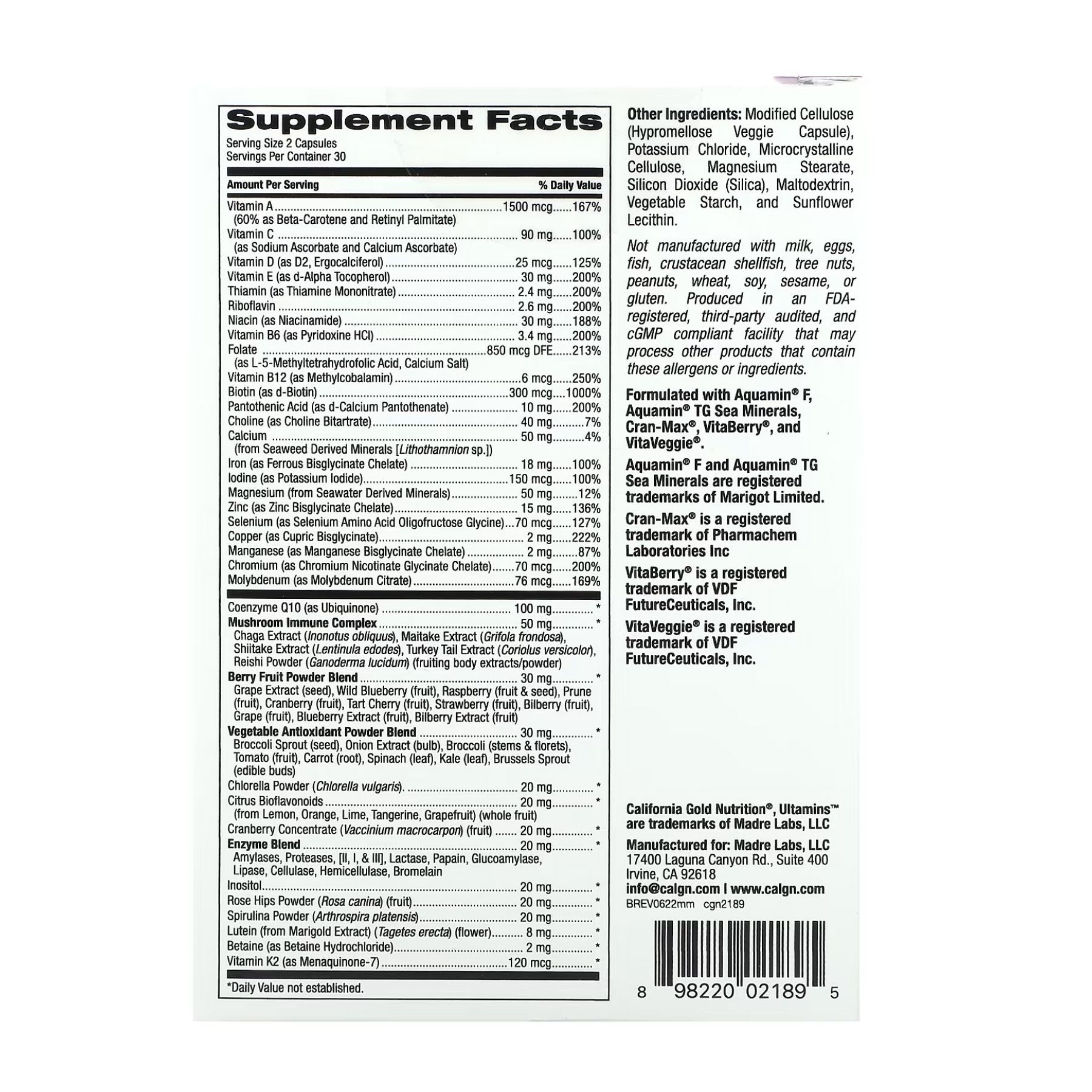 Містить морські мінерали Aquamin F, Aquamin TG, Cran-Max, VitaBerry, VitaVeggie.