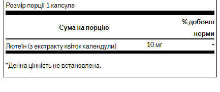 Підтримка здорового зору Захищає від пошкодження вільними радикалами Сприяє здоровій і сильній макулі Підтримайте здоровий зір за допомогою Swanson Ultra Lutein. Лютеїн, каротиноїд, що міститься в шпинаті, підтримує здоров'я та силу жовтої плями ока. Це може вплинути на вашу здатність до детального бачення. Кожна капсула містить 10 мг лютеїну. Рекомендації щодо застосування: як харчова добавка приймайте по одній м'якій таблетці на день з їжею та водою.
