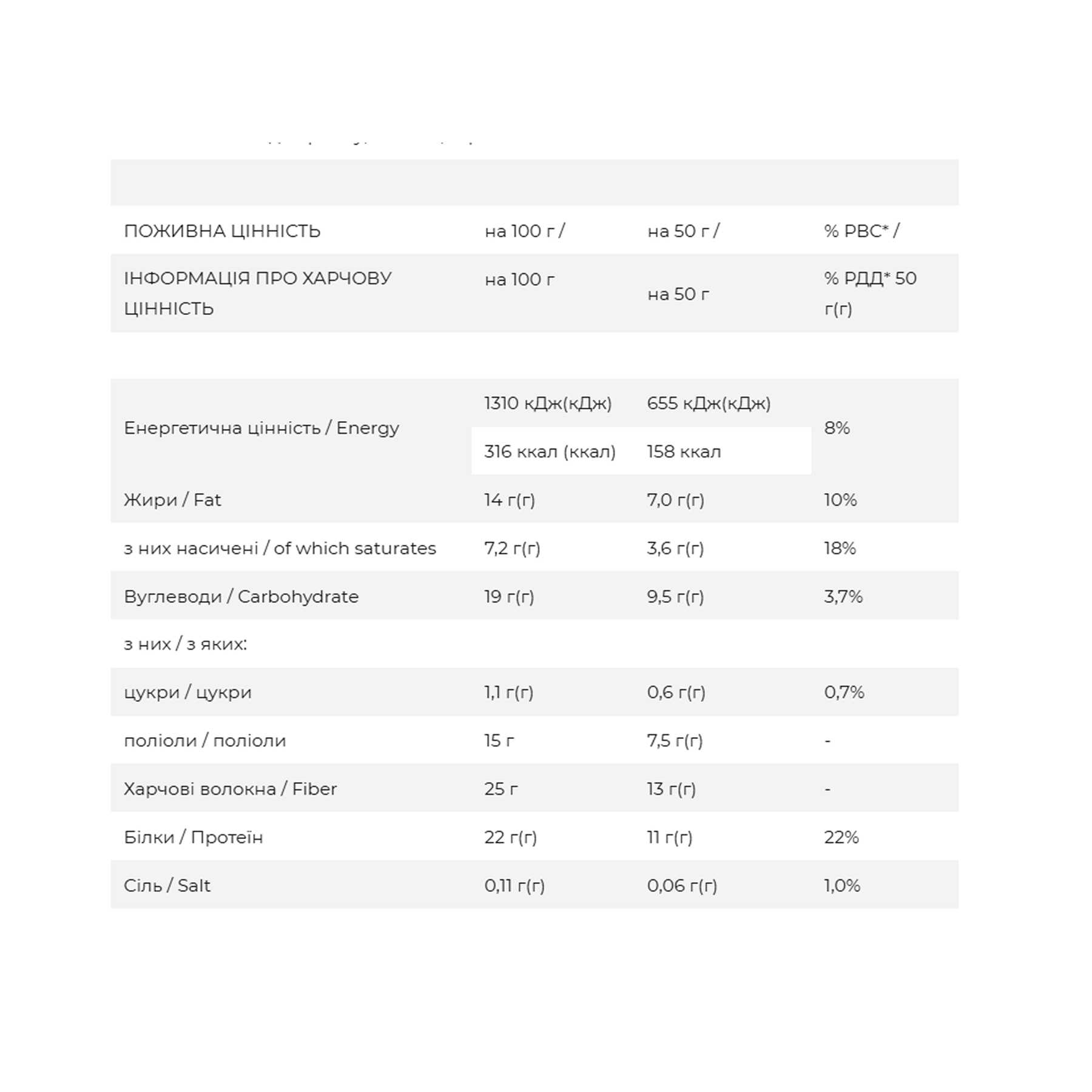 Склад: суміш рослинних білків 22% (ізолят соєвого білка, ізолят горохового білка, концентрат рисового білка, соняшниковий білок), харчові волокна (ізомальтоолігосахариди, розчинна кукурудзяна клітковина), глазур з підсолоджувачами 26% (харчові волокна [полідекстроза], какао-масло, підсолоджувачі [мальтит, стевіол-глікозиди зі стевії], какао-порошок, емульгатор: соєвий лецитин, натуральний ароматизатор), кокосова олія, підсолоджувачі (мальтит, стевіол-глікозиди зі стевії), лимонна начинка 14% (харчові волокна [ізомальтоолігосахариди]), яблучне пюре, підсолоджувач: мальтит, концентрований лимонний сік 0,8%, кукурудзяний крохмаль, регулятор кислотності: лимонна кислота), алкалізований какао-порошок 3%, рисові кульки (рисове борошно, сіль), зволожувач: рослинний гліцерин, емульгатор: соєвий лецитин, натуральний ароматизатор, морська сіль, антиоксидант: вітамін Е (токоферолу ацетат). Може містити сліди арахісу, молока, горіхів.