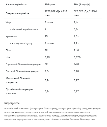 Завдяки відсутності глютену та лактози білок рису швидко засвоюється, тому відразу після їжі ви відчуєте легкість, і вам не будуть загрожувати проблеми з газоутворенням. Білок рису має високу концентрацію аланіну, аргініну, цистеїну, метіоніну та фенілаланіну. ALLNUTRITION – Vegan Pea Protein ідеально підходить як заміна знежиреної або низьковуглеводної їжі, а також після тренування – для збільшення м'язової маси та її регенерації.