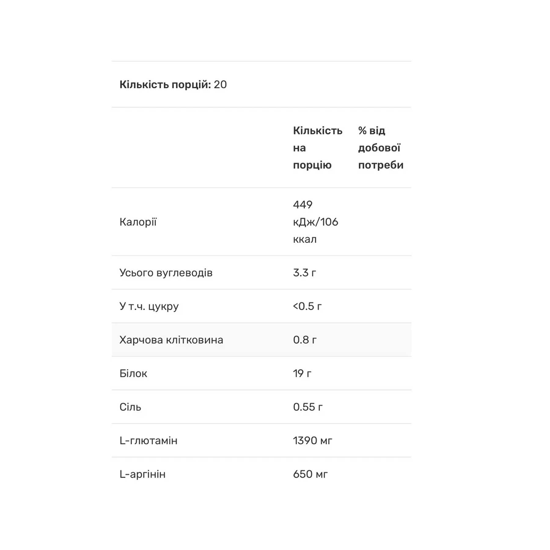 Одну порцію протеїну (25 г) розмішати в 250-300 мл води. Приймати відразу після тренування або між основними прийомами їжі.