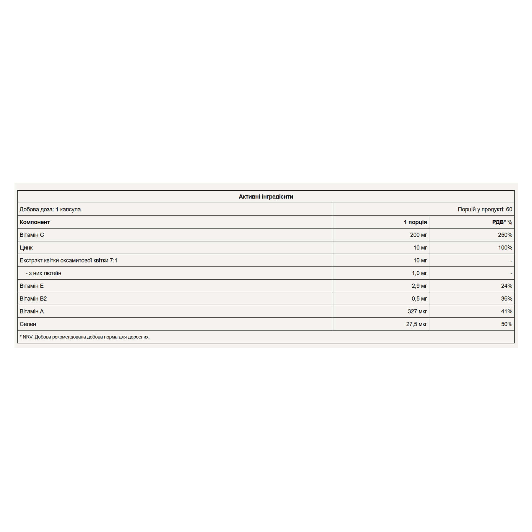 Склад : наповнювач (мікрокристалічна целюлоза), L-аскорбінова кислота, оболонка капсули [бичачий желатин, очищена вода, барвники (оксиди та гідроксиди заліза)], бісгліцинат цинку, збагачені селеном сухі дріжджі, екстракт квіток чорнобривців прямостоячих (Tagetes erecta L.) 7:1 (містить 10% лютеїну), бета-каротин, порошок DL-альфа-токоферилацетату, кукурудзяний крохмаль, ретинілацетат, рибофлавін.