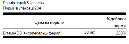 Наші рідкі краплі Swanson Premium з вітаміном D3 – це найпростіший спосіб доповнити вашу норму вітаміну D наступного разу, сидячи на вулиці на сонці, щоб отримати «сонячний вітамін». Ви отримуєте 50 мкг (2000 МО) на кожну порцію. Немає нічого простішого. При дозуванні 400 МО на краплю він також спрощує налаштування залежно від ваших конкретних потреб, які ви і ваш лікар. Інші інгредієнти: оливкова олія. Рекомендації щодо застосування: як харчова добавка приймати по п'ять крапель під час їжі один раз на день або за вказівкою лікаря. Можна додавати до їжі або змішувати з іншими рідинами, такими як вода або сік. Добре збовтати перед кожним використанням.