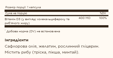 Вітамін D — це жиророзчинний вітамін, який сприяє засвоєнню кальцію, що сприяє підтримці здорових кісток і зубів. Вітамін D також підтримує здорову імунну систему. У цьому продукті використовується масло з печінки глибоководних холодноводних риб. Масло було очищено для усунення ртуті та ПХБ. Ця формула пропонується в м’яких капсулах на масляній основі для сприяння оптимальному поглинанню та засвоєнню.
