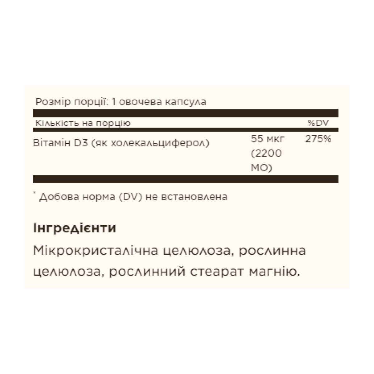 Вітамін D необхідний для сприяння засвоєнню кальцію, який допомагає підтримувати здоровий стан кісток і зубів. Вітамін D підтримує здоров’я імунної системи. Ця формула містить вітамін D3 в зручних вегетаріанських капсулах, які легко ковтати.