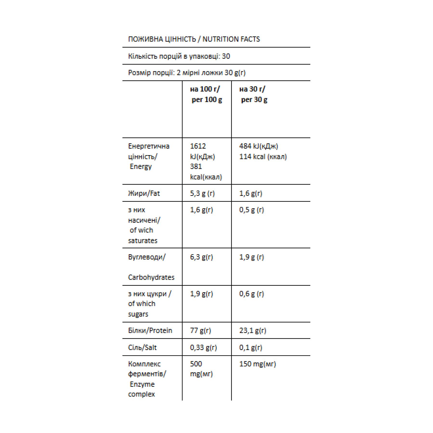 Високий вміст білка (77%): сприяє ефективному нарощуванню та відновленню м'язової тканини.