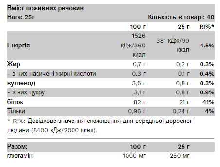 Рекомендоване дозування: одну порцію (25 г) змішайте з 250 мл води або нежирного або рослинного молока на ваш смак. Приймайте дві порції в тренувальні дні. Приймайте одну порцію після тренування та іншу порцію між прийомами їжі.