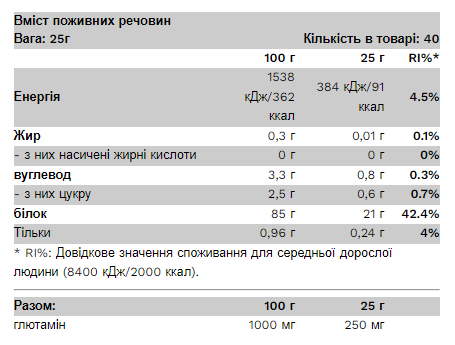 Рекомендоване дозування: одну порцію (25 г) змішайте з 250 мл води або нежирного або рослинного молока на ваш смак. Приймайте дві порції в тренувальні дні. Приймайте одну порцію після тренування та іншу порцію між прийомами їжі.