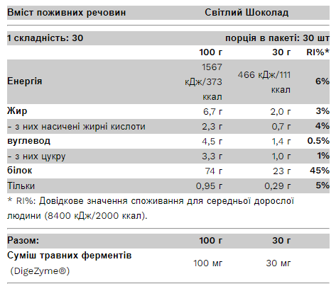 Інгредієнти (Light Strawberry): концентрат сироваткового протеїну з перехресним потоком мікрофільтрованого молока [емульгатор: соняшниковий лецитин], хлорид натрію, ароматизатор полуниці, барвник: червоний буряк, підсолоджувачі: ацесульфам-К, сукралоза; загущувач: ксантанова камедь; Суміш травних ферментів DigeZyme® (альфа-амілаза, нейтральна протеаза, целюлаза, лактаза, ліпаза)