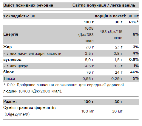 Інгредієнти (Light Strawberry): концентрат сироваткового протеїну з перехресним потоком мікрофільтрованого молока [емульгатор: соняшниковий лецитин], хлорид натрію, ароматизатор полуниці, барвник: червоний буряк, підсолоджувачі: ацесульфам-К, сукралоза; загущувач: ксантанова камедь; Суміш травних ферментів DigeZyme® (альфа-амілаза, нейтральна протеаза, целюлаза, лактаза, ліпаза)
