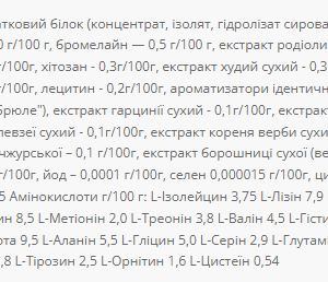 Whey protein зі смаком універсальна протеїнова матриця, яка містить унікальні рослинні речовини, комплекс вітамінів та мінералів, необхідних організму. Уявіть собі коктейль із стиглого, солодкого банана, незбираного молока та карамельного сиропу, збитого в м'якій пінки. Саме такий протеїновий коктейль приготувала компанія Power Pro для всіх ласунів та любителів екзотичного фрукта. Але на відміну від солодкого десерту, протеїновий коктейль не містить жиру та цукру. Коктейль допоможе витримати найжорстокішу дієту, за рахунок своєї солодощі та густоти. У протеїну пудроподібна текстура, яка повністю розчиняється, без грудок, перетворюючи будь-яку рідину на шовковистий, однорідний, неймовірно смачний і корисний коктейль. WHEY PROTEIN Power Pro класичний протеїновий коктейль з екзотичним смаком. Структура порошку дозволяє йому повністю, без грудок, розчинятися у звичайній воді. Ця властивість дозволяє використовувати протеїновий коктейль навіть при суворій дієті або сушіння. Одна порція, близько 2-х ст. л. суміші, розчинена у воді міститиме 28,8 г білка і всього 142,4 калорій. Всі отримані білки підуть на відновлення м'язів, тому що в протеїновій суміші немає важких молочних білків типу казеїну, які застоюються в шлунку. Коктейль складається з високоякісного голландського протеїну Friesland Campina DMV BV,, що швидко засвоюється, з трикомпонентною матрицею з ультрафільтрованого сироваткового концентрату, ізоляту і гідролізату сироваткових пептидів. Протеїновий коктейль не містить вуглеводів та жирів. Як регулятор обміну речовин і гарант здоров'я нирок при інтенсивному білковому харчуванні виступає льон. Льон – головне джерело жирних кислот омега-3. Омега-3 покращує функцію нирок, знижує рівень поганого холестерину, прискорює обмін жирів. Ще один цікавий побічний ефект покращення стану шкіри, нігтів та волосся. Роблять волосся блискучим і шовковистим. Зміцнити здоров'я допоможе швейцарський вітамінний комплекс DSM Nutritional Products Europe LTD, з цинком та селеном у своєму складі. Поки протеїн будує Ваші м'язи, селен і цинк відновлюють Ваші антитіла до простудних захворювань. Солодкий смак протеїну забезпечує відомий спортивний замінник на цукор ацесульфам. Ацесульфам відмінник серед цукрозамінників. Старанний, абсолютно нешкідливий та абсолютно некалорійний. Він визнаний суворими і манірними Англією та Німеччиною, спокійною Канадою та буйною Австралією. На даний момент це найкращий цукрозамінник.