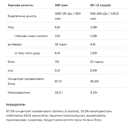 ALLNUTRITION Whey Protein можна використовувати у будь-який час доби, що робить їх дуже універсальними. Ви можете легко додавати їх до протеїнових коктейлів, вівсянки, десертів або випічки. Як бачите, цей білок має безліч застосувань, що робить його унікальним. Безкомпромісний смак, розчинність (кілька разів збовтайте шейкер) та якість – ось що таке ALLNUTRITION Whey Protein!