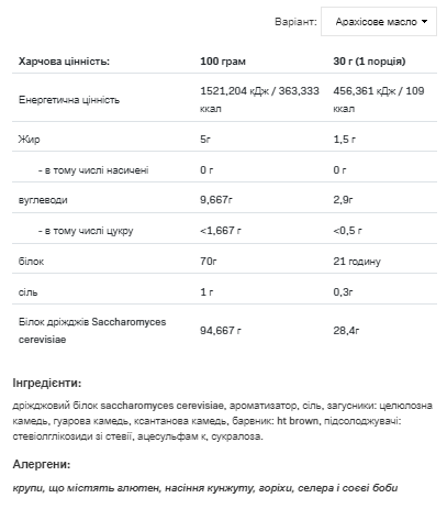 Штрихкод: 5902837744513ALLNUTRITION YYAST PROTEIN – чудова альтернатива тваринному або рослинному білку. Він отриманий екологічно чистим способом, що робить його придатним для всіх як для людей, які щодня збагачують свій раціон тваринним білком, так і для вегетаріанців і веганів. Що варто знати про дріжджовий білок? Білок дріжджів характеризується високою біодоступністю. Він має найвищий бал 1 методом оцінки якості білка PDCAAS (оцінка амінокислот з поправкою на засвоюваність білка). Оцінка 1 еквівалентна тваринним білкам, таким як казеїн чи яєчний білок. Це означає, що дріжджовий білок має високу біодоступність та забезпечує 100% незамінних амінокислот, необхідних на одиницю білка при перетравленні. Більше того, харчова цінність та засвоюваність дріжджового білка такі ж, як у молочних білків, і набагато вища, ніж у рослинних білків. Дріжджовий білок містить 70% високоякісного білка з комплексом екзогенних амінокислот, у тому числі з високим вмістом BCAA. Дріжджі є одним із багатих джерел вітамінів групи В, включаючи біотин та фолієву кислоту. Вони також містять мінерали, такі як селен, калій, фосфор, залізо та хром. Цей білок відноситься до групи білків, що повільно засвоюються, завдяки чому допомагає забезпечити постійний приплив амінокислот, що запобігає розпаду м’язової тканини, тому є відмінним джерелом білка для фізично активних людей. Крім того, дріжджовий білок збільшує відчуття ситості. Дріжджовий білок повністю безпечний, при його виробництві не використовуються пестициди, антибіотики або гормони, тому він позбавлений слідових кількостей цих речовин. Крім того, він не містить ГМО. ALLNUTRITION YYAST PROTEIN доступний у чотирьох чудових смаках: Горіхове масло, кава, солена карамель, шоколад. Кожен із смаків відрізняється відмінною розчинністю і трохи густішим за традиційні протеїнові добавки. Продукт також містить доданого цукру. Одна порція містить менше ніж 0,5 г простих цукрів. ALLNUTRITION YYAST PROTEIN створений для задоволення вимог найвибагливіших споживачів, які шукають багатофункціональність продуктів, які вони вибирають, і цінують принципи сталого розвитку, а також приділяють увагу безпеці виробничих процесів для навколишнього середовища. Змішайте 30 г продукту (1 мірну ложку) із 200 мл води. Вживати відразу після приготування. Не перевищуйте кількість 1 порції на день.