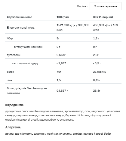 Штрихкод: 5902837744520ALLNUTRITION YYAST PROTEIN – чудова альтернатива тваринному або рослинному білку. Він отриманий екологічно чистим способом, що робить його придатним для всіх як для людей, які щодня збагачують свій раціон тваринним білком, так і для вегетаріанців і веганів. Що варто знати про дріжджовий білок? Білок дріжджів характеризується високою біодоступністю. Він має найвищий бал 1 методом оцінки якості білка PDCAAS (оцінка амінокислот з поправкою на засвоюваність білка). Оцінка 1 еквівалентна тваринним білкам, таким як казеїн чи яєчний білок. Це означає, що дріжджовий білок має високу біодоступність та забезпечує 100% незамінних амінокислот, необхідних на одиницю білка при перетравленні. Більше того, харчова цінність та засвоюваність дріжджового білка такі ж, як у молочних білків, і набагато вища, ніж у рослинних білків. Дріжджовий білок містить 70% високоякісного білка з комплексом екзогенних амінокислот, у тому числі з високим вмістом BCAA. Дріжджі є одним із багатих джерел вітамінів групи В, включаючи біотин та фолієву кислоту. Вони також містять мінерали, такі як селен, калій, фосфор, залізо та хром. Цей білок відноситься до групи білків, що повільно засвоюються, завдяки чому допомагає забезпечити постійний приплив амінокислот, що запобігає розпаду м’язової тканини, тому є відмінним джерелом білка для фізично активних людей. Крім того, дріжджовий білок збільшує відчуття ситості. Дріжджовий білок повністю безпечний, при його виробництві не використовуються пестициди, антибіотики або гормони, тому він позбавлений слідових кількостей цих речовин. Крім того, він не містить ГМО. ALLNUTRITION YYAST PROTEIN доступний у чотирьох чудових смаках: Горіхове масло, кава, солена карамель, шоколад. Кожен із смаків відрізняється відмінною розчинністю і трохи густішим за традиційні протеїнові добавки. Продукт також містить доданого цукру. Одна порція містить менше ніж 0,5 г простих цукрів. ALLNUTRITION YYAST PROTEIN створений для задоволення вимог найвибагливіших споживачів, які шукають багатофункціональність продуктів, які вони вибирають, і цінують принципи сталого розвитку, а також приділяють увагу безпеці виробничих процесів для навколишнього середовища. Змішайте 30 г продукту (1 мірну ложку) із 200 мл води. Вживати відразу після приготування. Не перевищуйте кількість 1 порції на день.